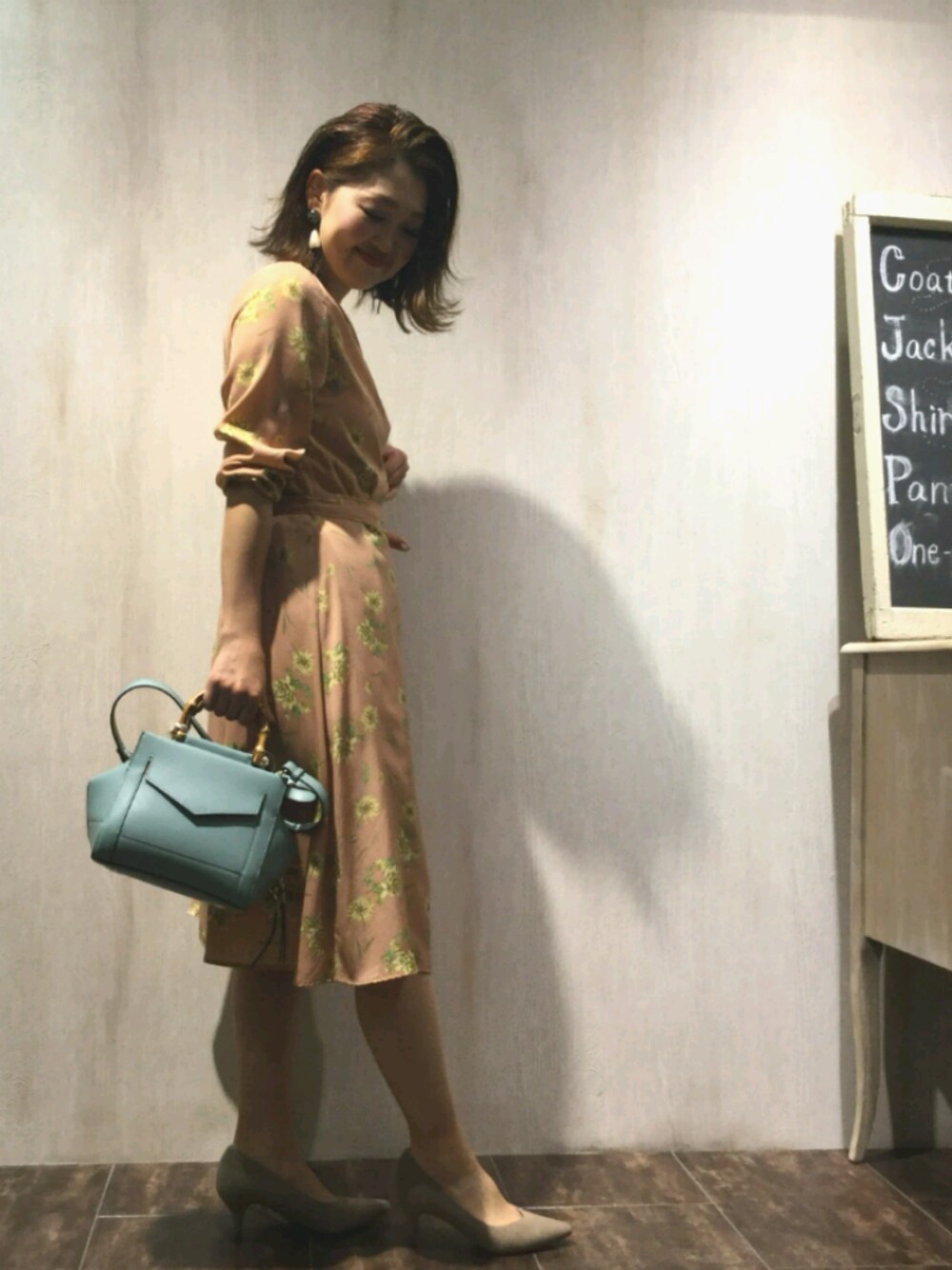 emiのワンピース「ピーチサテンプリントワンピース」を使ったコーディネート