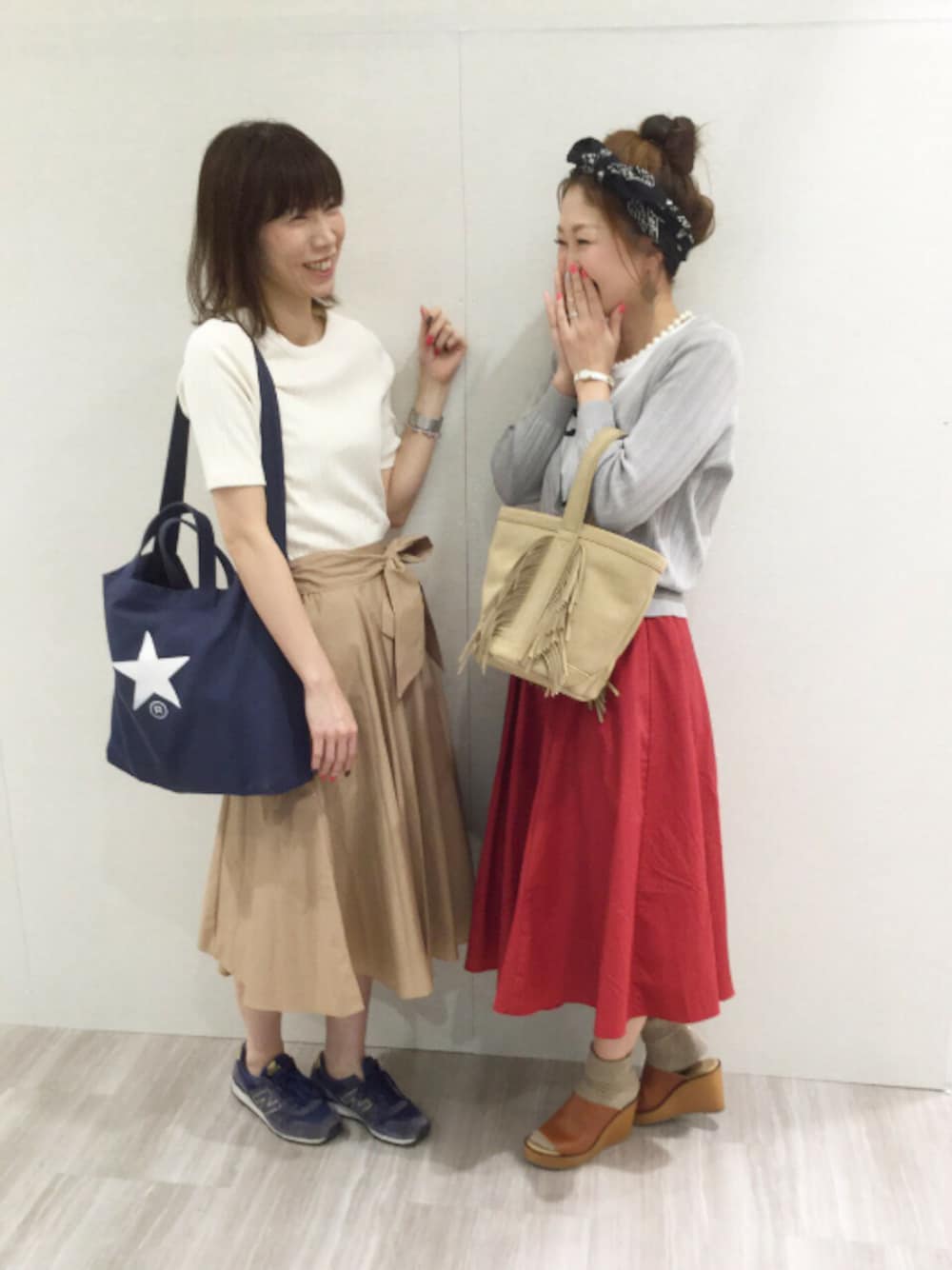 今日は鎌田さんと一緒におそろいコーデ❤ 人気のボリュームフレアスカート😍 足元を変えるとまた雰囲気が変わりますね✨