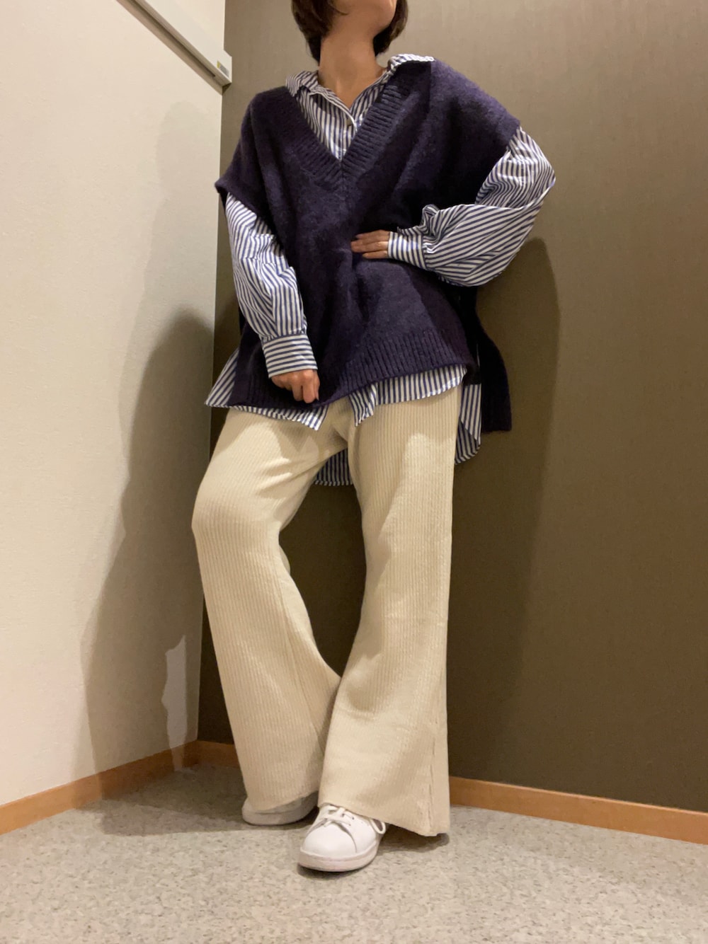 お気に入りアイテムをレイヤードしたスタイル。 マキシ丈ワンピの上にレイヤードしても ちょうどいいニットベスト。