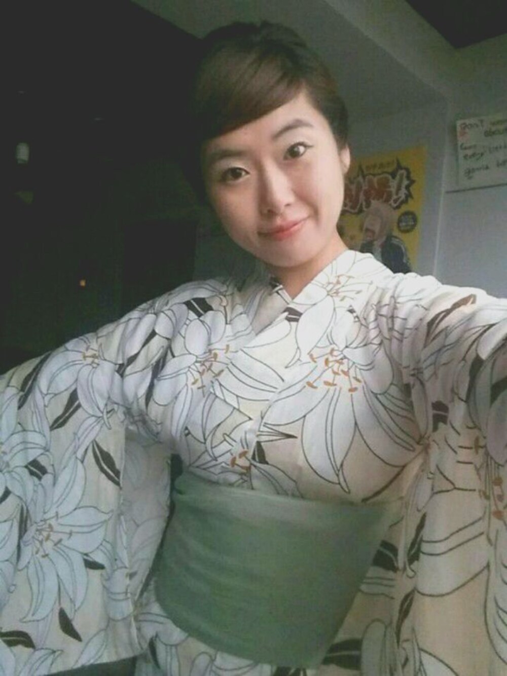 ベージュ系の浴衣を着用したレディースの夏コーディネートの1枚目の写真