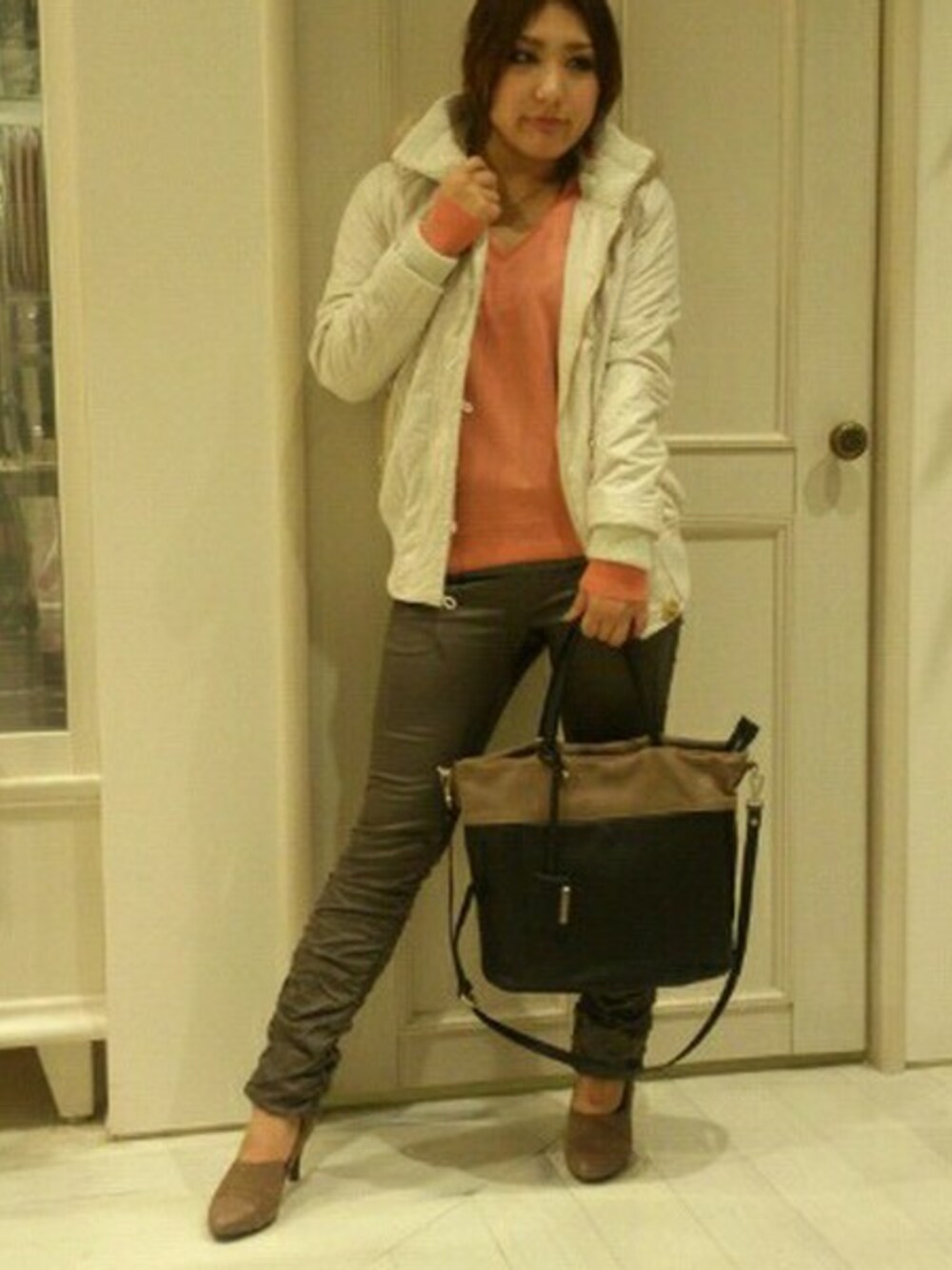 光沢感のあるアウターにさし色としてカラーニットを!