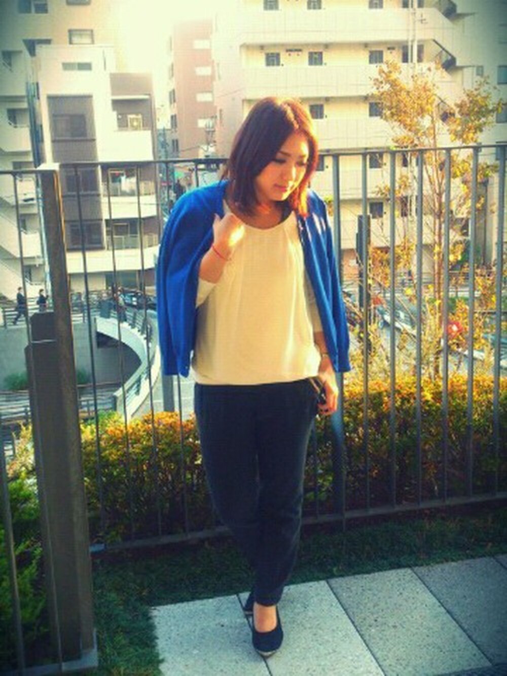 ツインニットのカーディガンを着回し!! 短めのニットでタックパンツとの相性も抜群です。