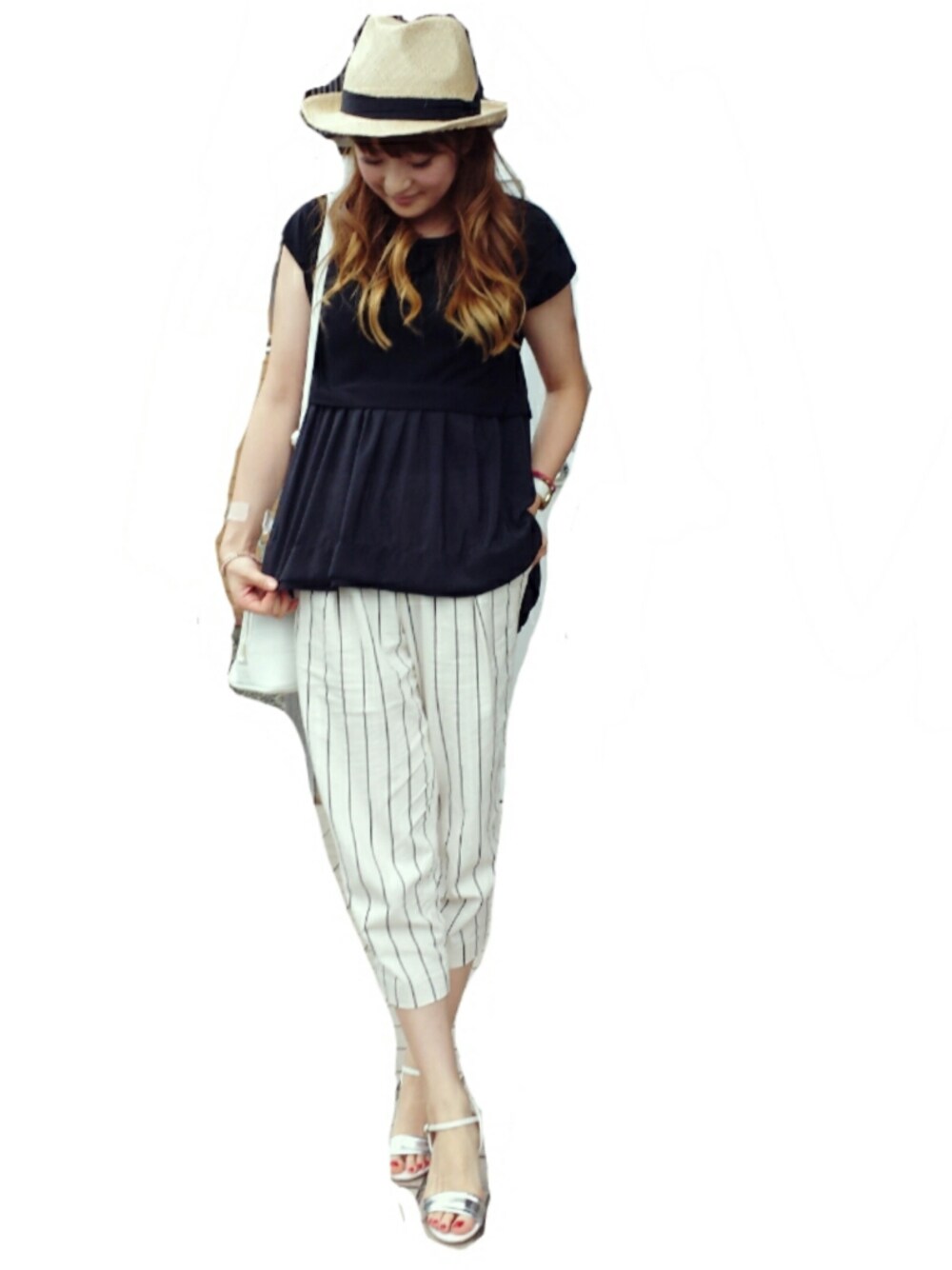 ブラック系のTシャツ/カットソーを着用したレディースの夏コーディネートの1枚目の写真