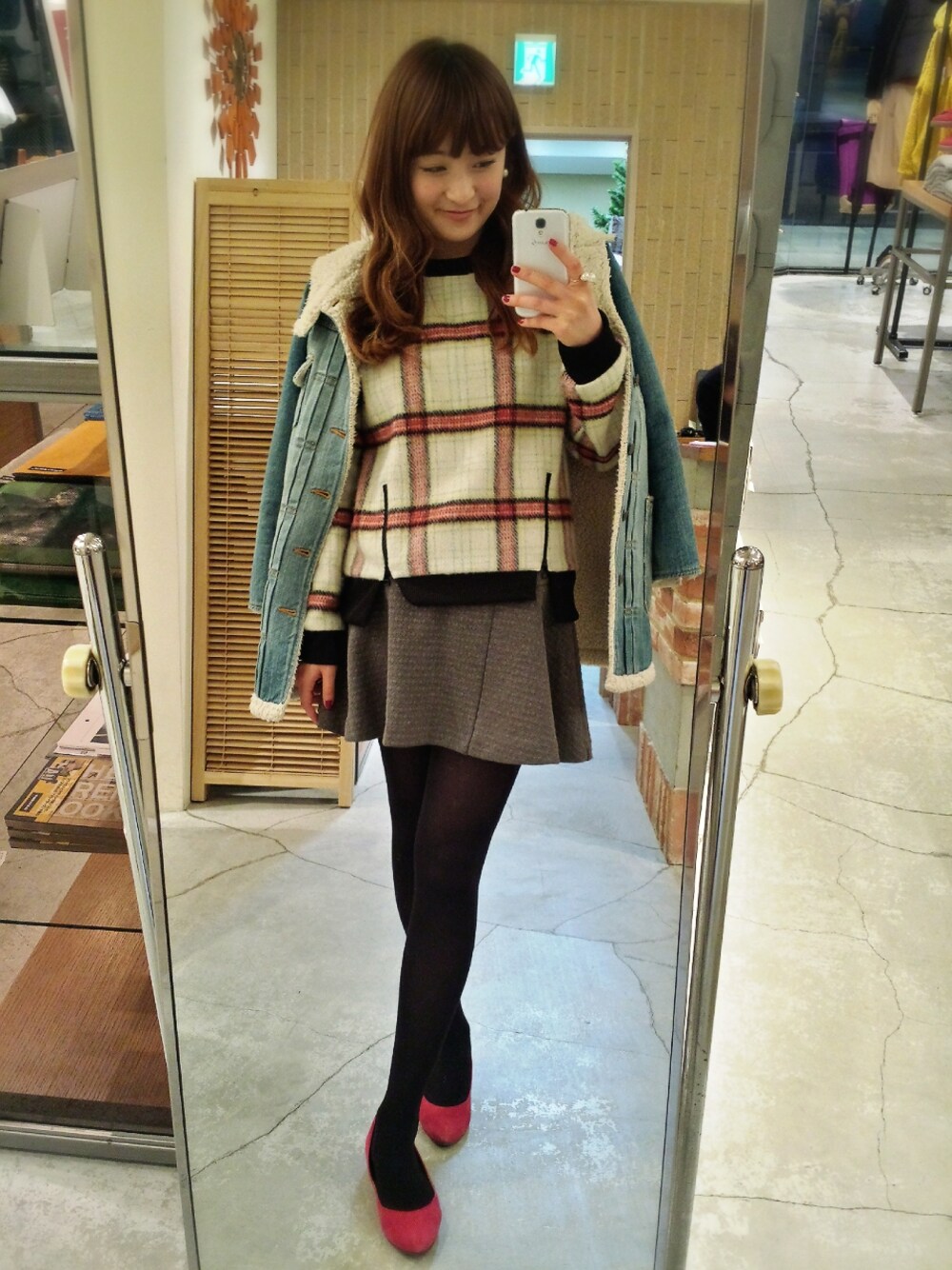 なかなかお気に入りな今日のコーデ(•ө•)♡ メイドインのチェック、可愛いわぁ(*´ェ`*)ポッ