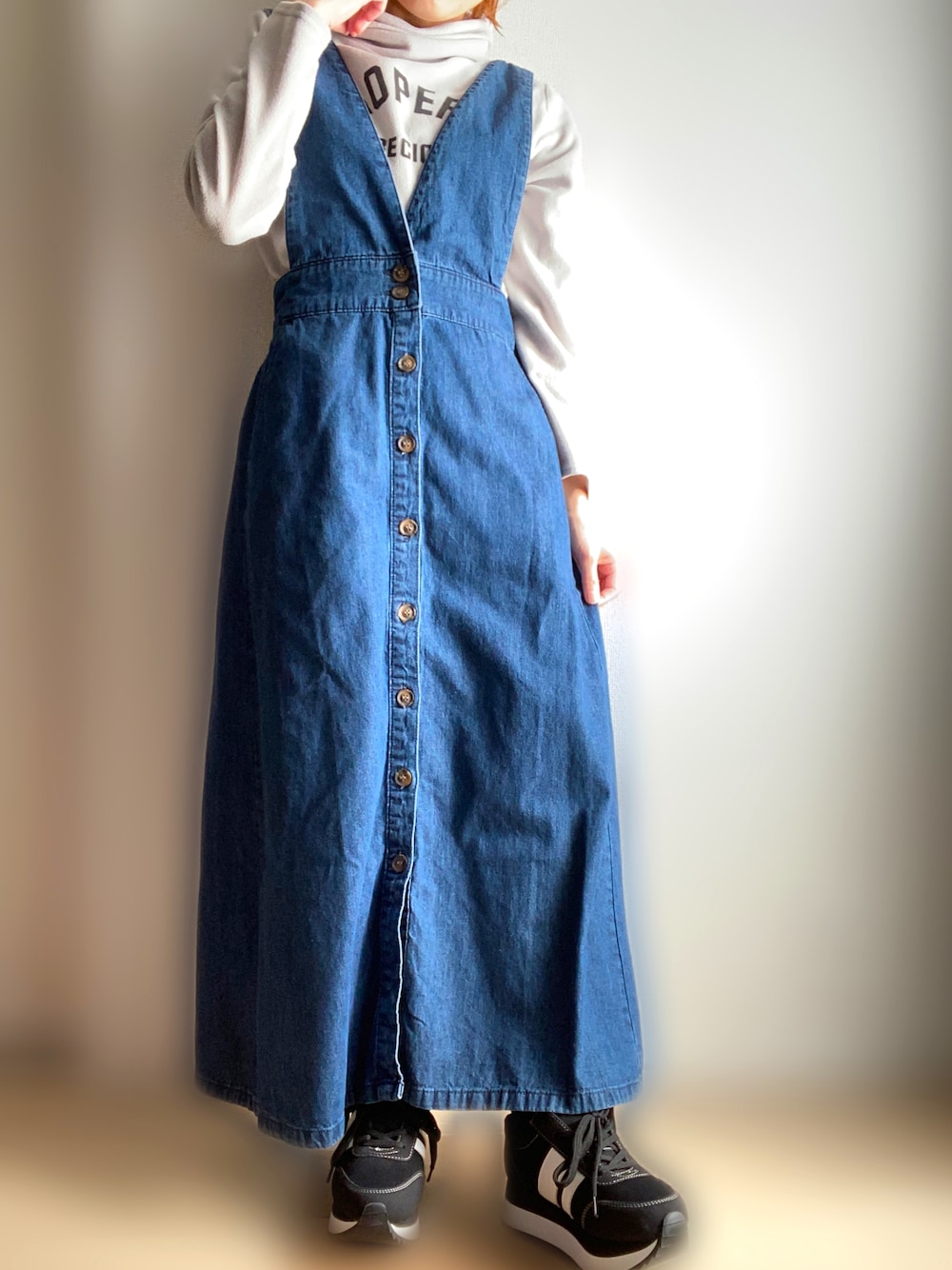 miii。のジャンパースカート「ミディ丈ジャンスカ」を使ったコーディネート