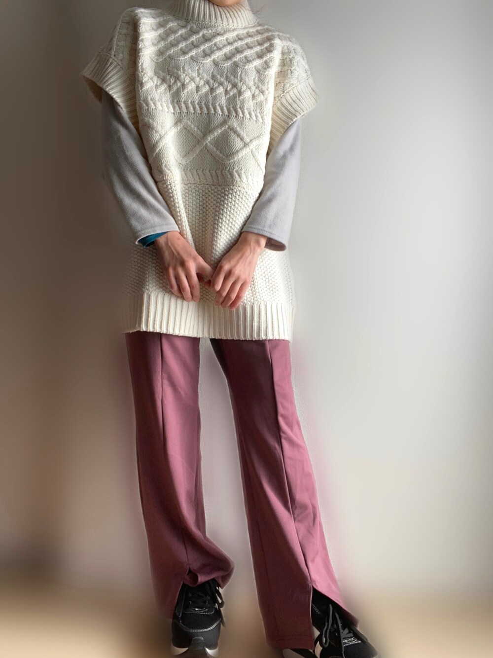 miii。のベスト「ノースリーブケーブルニットベスト」を使ったコーディネート