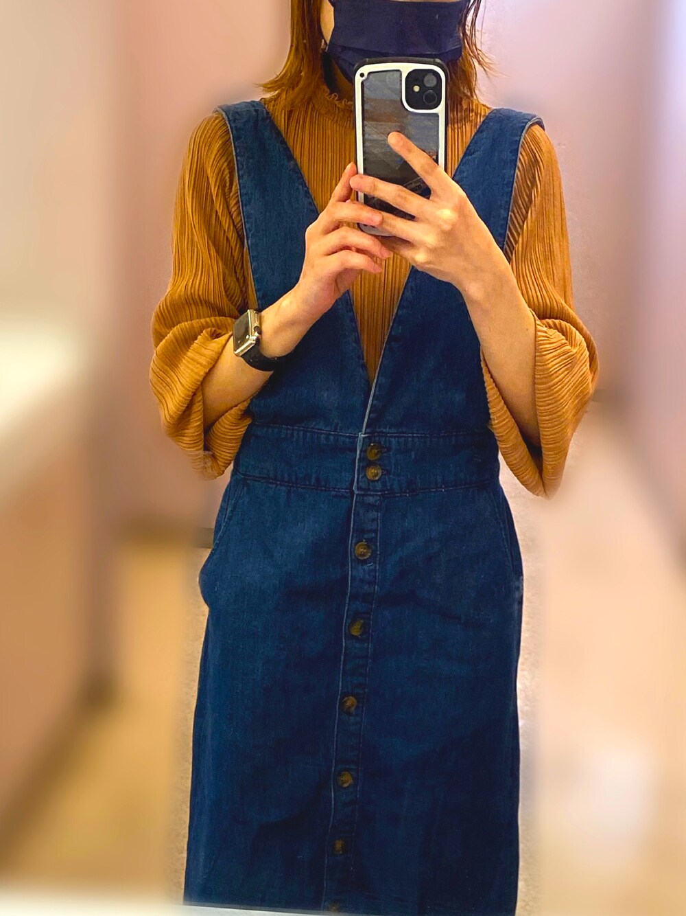 miii。のジャンパースカート「ミディ丈ジャンスカ」を使ったコーディネート