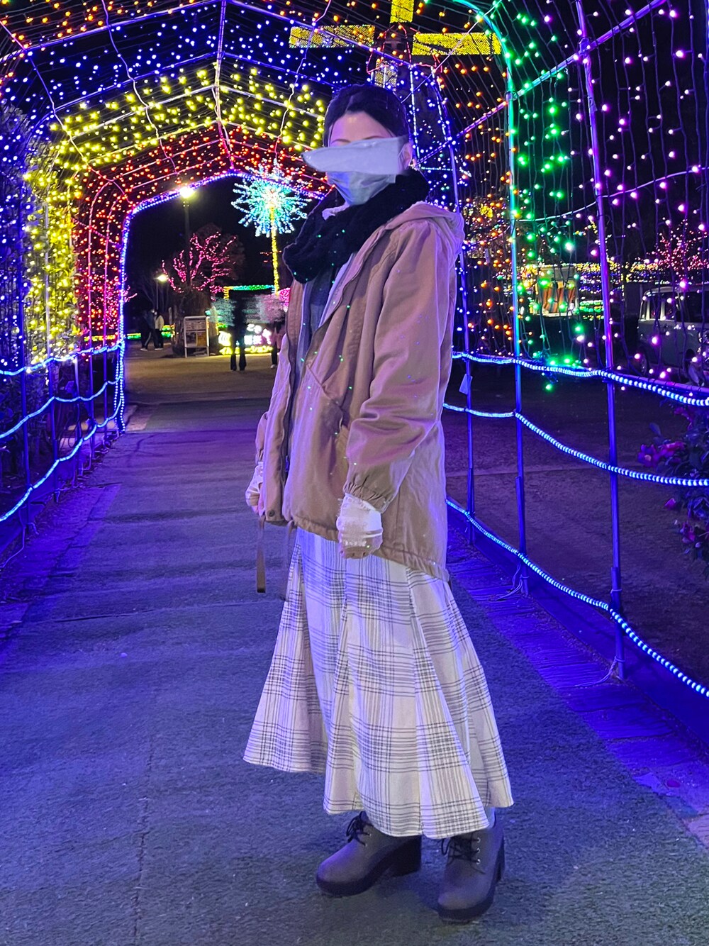 イルミネーション見に行った時のコーデ☺︎ 平日に行ったら全然混んでなくてゆっくり見れたし、めっちゃキレイで感動でした♡ 中にファーベストを着て、ボア付きモッズコート着て寒さ対策バッチリ◎