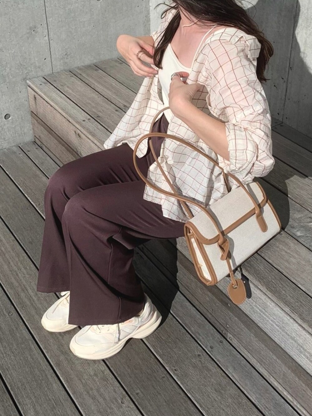 ホワイト系のスニーカーを着用したレディースの秋コーディネートの1枚目の写真