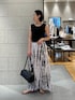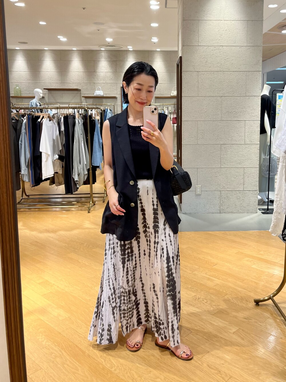 夏に履きたくなるタイダイのプリントスカート。 揺れ感も綺麗でシェルボタンもアクセントとなる着映えスカートです。 旅行やリゾートシーンにも活躍してくれそう。 シンプルなトップスやTシャツ合わせもおすすめ。 私はジレを羽織って大人っぽさ、モードな雰囲気をプラスしてみました。 スカートは36サイズを着用してます。