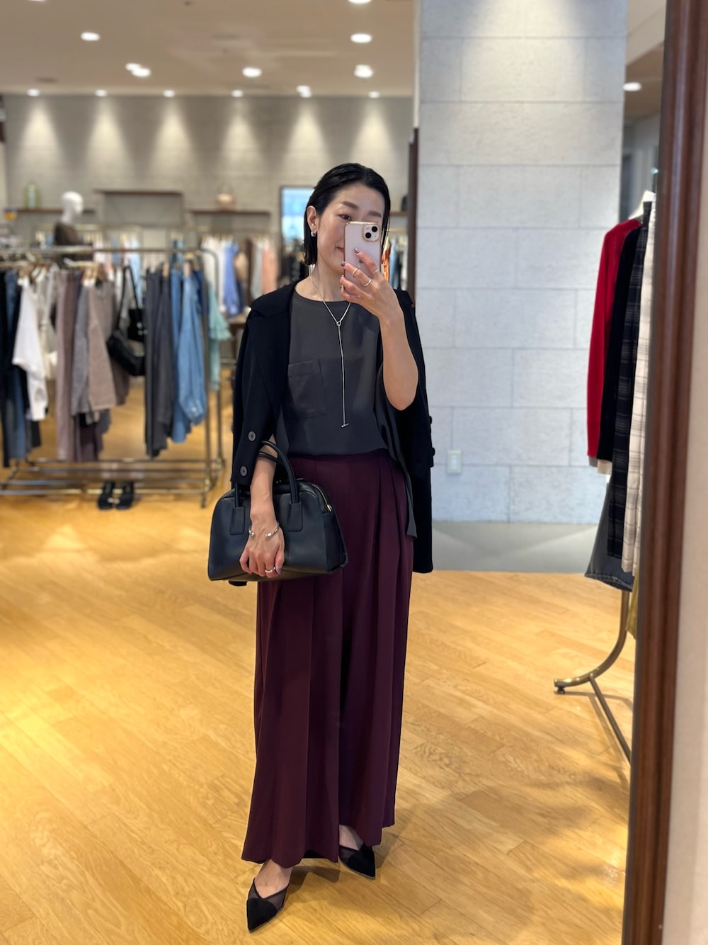 人気のタックワイドスラックスに新色のボルドーが登場。 手持ちのトップスに合わせるだけで、一気に秋っぽくなるカラー。 涼しく着れるブラウスはオンオフ着回しの効く万能アイテム。 秋になったらジャケットなどのインナーにも重宝します。 接触冷感のニットジャケットは着心地もとても良く、季節の変わり目にカーディガン感覚で羽織っていただけます。 ショート丈なので、シンプルなコーディネートに羽織るだけで今っぽさも加わり、お洒落見えが叶う1着。 パンツ/36サイズ着用