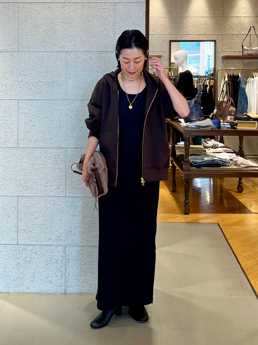 バックテールのパーカーはきれいめに見える素材 で大人っぽく羽織っていただけます。 ゴールドのジップなのでカジュアルさの中にも華やかさと女性らしい雰囲気も出せる1枚。 ワンピースやスカートとコーディネートすると、きれいめカジュアルに使っていただけます。 ノースリのワンピに羽織れば今すぐ着れる秋コーデの完成。 ファーのバッグやブーツなど小物でより季節感をプラスしました。 ワンピースはフリーサイズを着用しています。