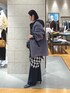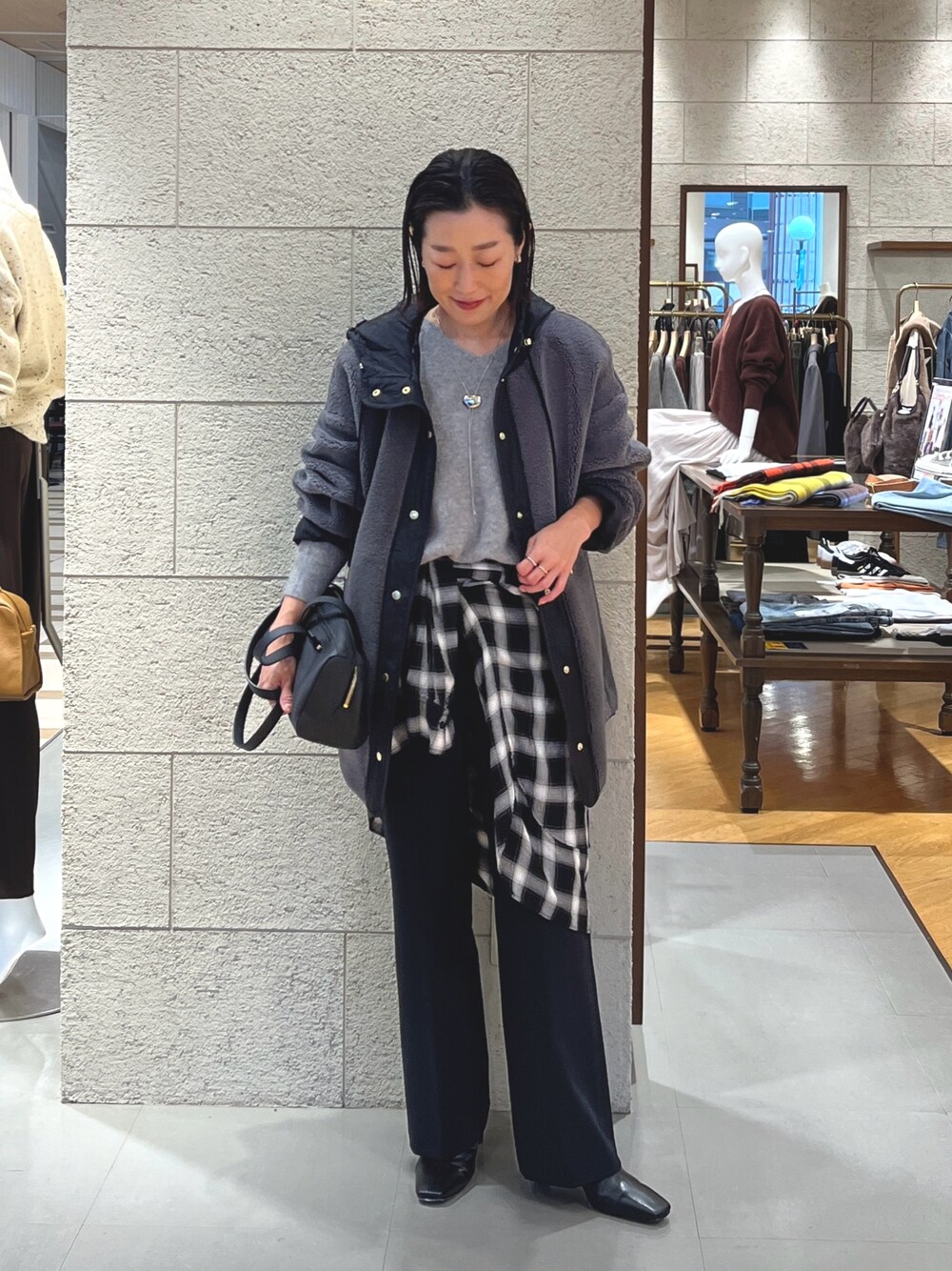 人気のフードボアコートをモノトーンでまとめた大人カジュアルスタイル。 ボアコートはニットを中に着ても着膨れも気にならずに着れて、とても軽いのも特徴。 ゴールドのボタンもポイントになってくれます。 チェックシャツは腰巻きにしてアクセントにしたり、ニットの中にレイヤードして着ていただくのもおすすめ。