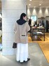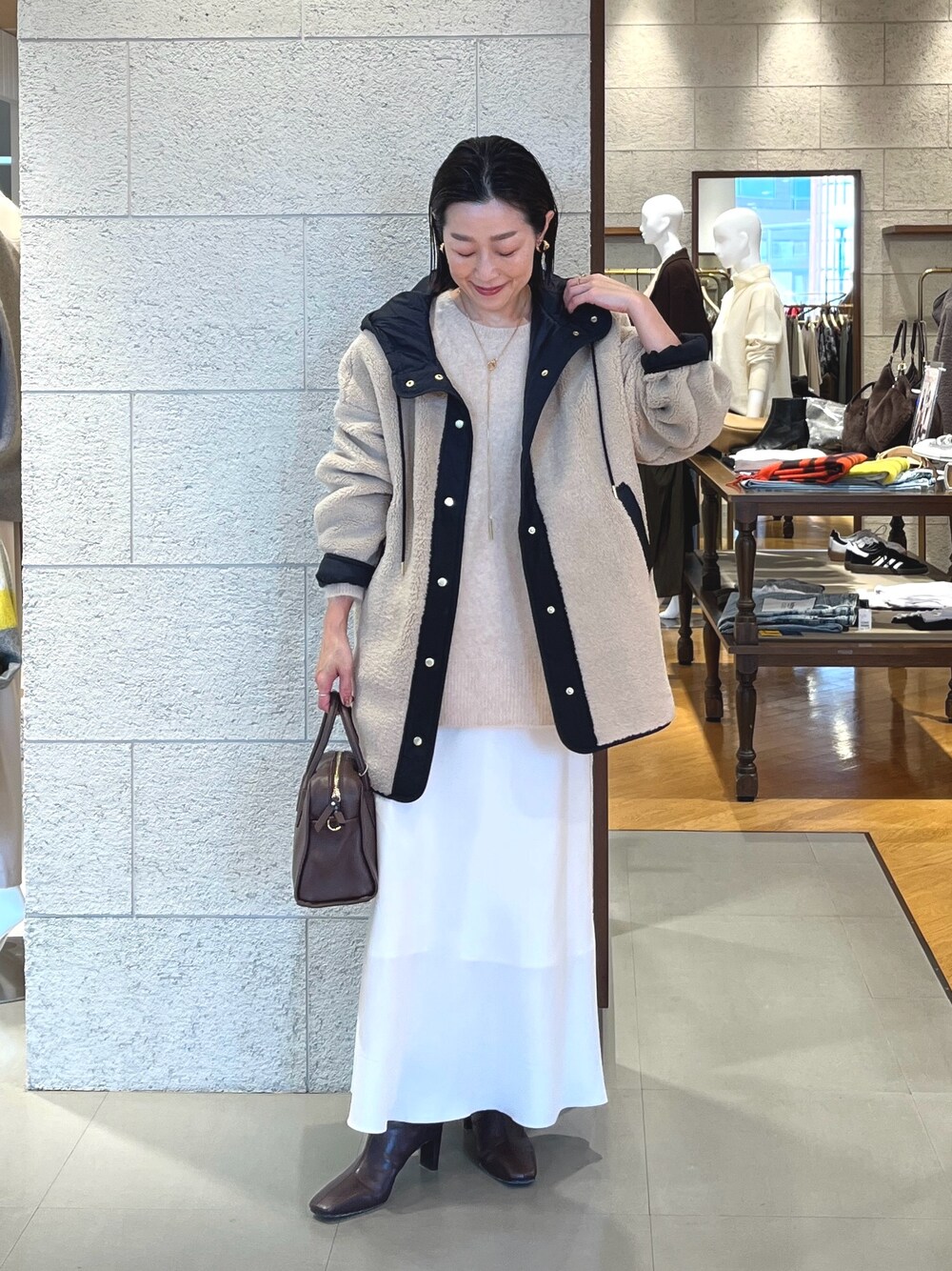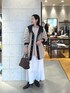 毎年人気のフードボアコートに新色のベージュが登場。 ベージュは馴染みもあり、きれいめなスタイルに羽織ってもしっくりと馴染んでくれます。 軽くてストレスなく羽織っていただけるボアコートはデイリー使いにも、ちょっとしたお出掛けにもピッタリ。 中に合わせたニットはふわふわとした軽い素材で、長めの着丈で腰回りもカバー。 キュプラスカートとの相性も良いです。 スカートは36サイズ着用。