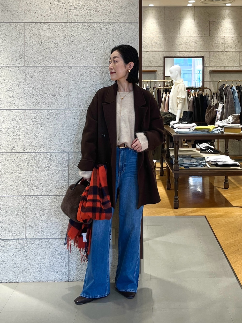 新作のニットとコートにデニムを合わせたきれいめカジュアルコーデ。 リバージャコットは今年らしいブラウンをチョイス。非常に軽くて着心地も良く、真冬の手前にも重宝するコート。 腰回りはしっかりカバーしてくれる丈感も安心です。 これからの時期はチェックのストールを巻いても防寒にもなり、コーディネートのアクセントになってくれます。