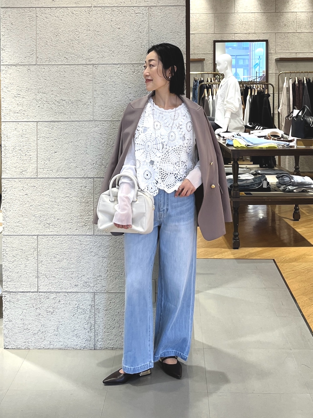 総刺繍のベストとデニムの合わせが春らしいコーディネート。 ベストはロンTやシャツをレイヤードしながら今から初夏まで着回し可能です。 ジャケットを羽織ってきれいめな要素をプラスすると大人っぽい雰囲気に。