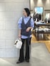 インフルエンサーコラボのストライプシャツ。 バックロゴが目を惹くシャツは落ち感もありシワも気になりにくい素材なので、上からビスチェなどもレイヤードしやすいです。 ビスチェはカシュクール風でシャツやカットソーと合わせると今っぽさも出ておすすめ。 美脚効果バツグンのパンツは裾にジップが付いており、スリットにしていただくと抜け感も出てより脚が綺麗に見えます。 ウエストも1周ゴムでストレスフリーの履き心地。 36サイズ着用。 どのアイテムもオンオフ問わずに着回しの効くアイテムです。