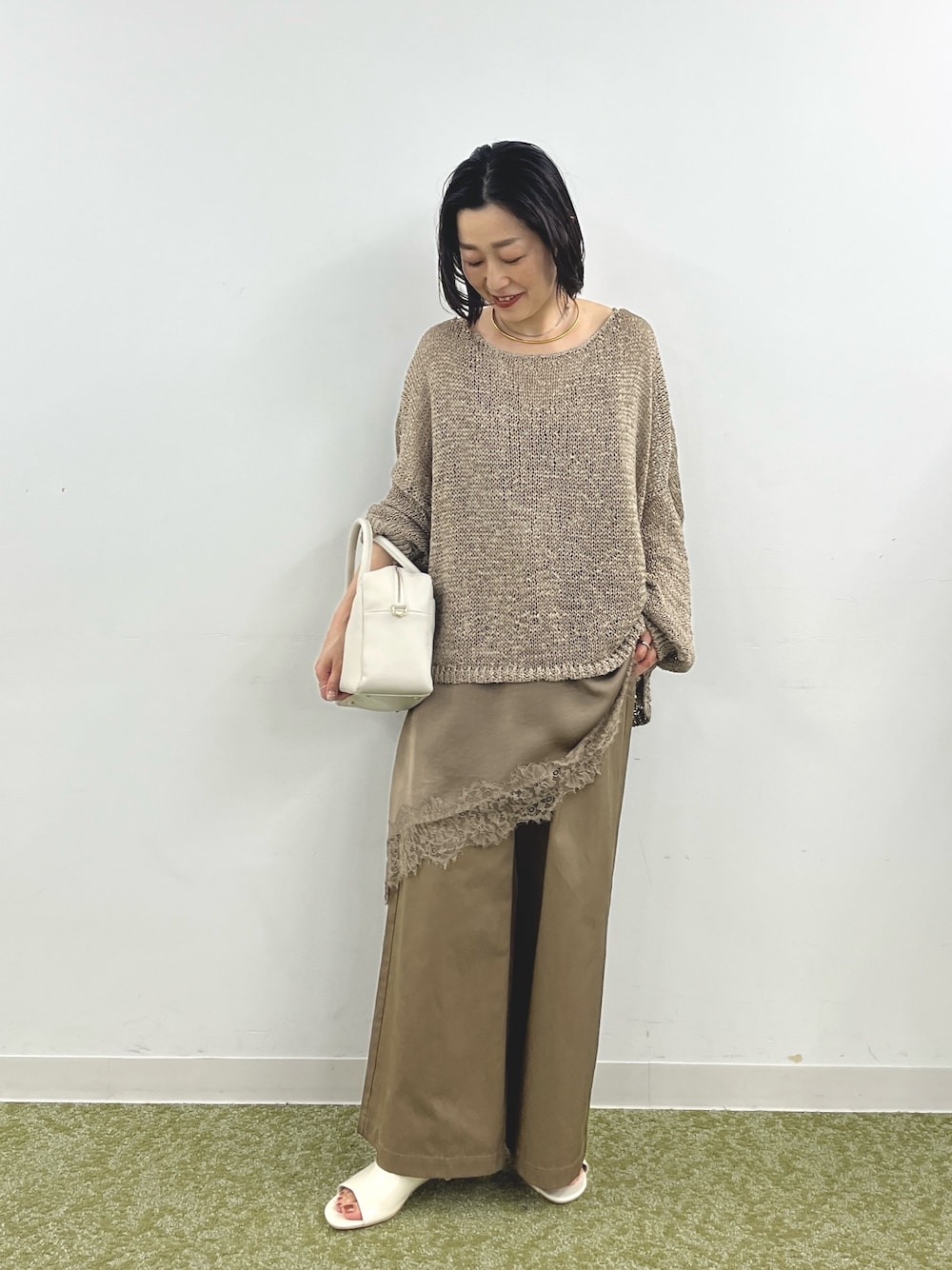 ざっくりとしたテープヤーンのプルオーバーは春から夏にかけて長く着回しを楽しめる1枚。 ゆるっとしたシルエットが女性らしさをプラスしてくれます。 ヘムラインのレースキャミをレイヤードすると一気に今年らしい着こなしに。 レースキャミは様々なアイテムに合わせるだけで今っぽさが出せておすすめです。 同系色のワイドパンツを合わせて大人っぽいワントーンコーデに仕上げました。 靴とバッグはオフホワイトで抜け感をプラス。