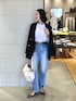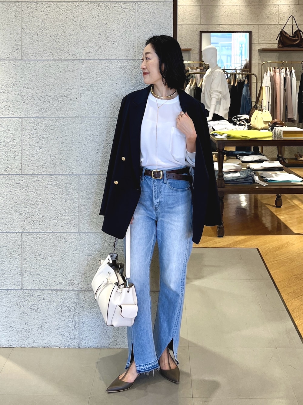 ジャケットはオンオフ使えるシルエットで少し肉感のある素材が季節の変わり目にも羽織りやすく、ストレッチも効いていて着心地もとても良いです。 ネイビーのジャケットは様々なシーンで使えるので1着持っておくと便利。 万能に使えるジョーゼットのポケットブラウスはジャケットのインナーにも合わせやすく、もちろん1枚着としても着回しの効くアイテム。 ブラウスはPMサイズを着用。 美脚見えのスリット入りデニムを合わせれば、定番の春のお出かけコーデの完成です。