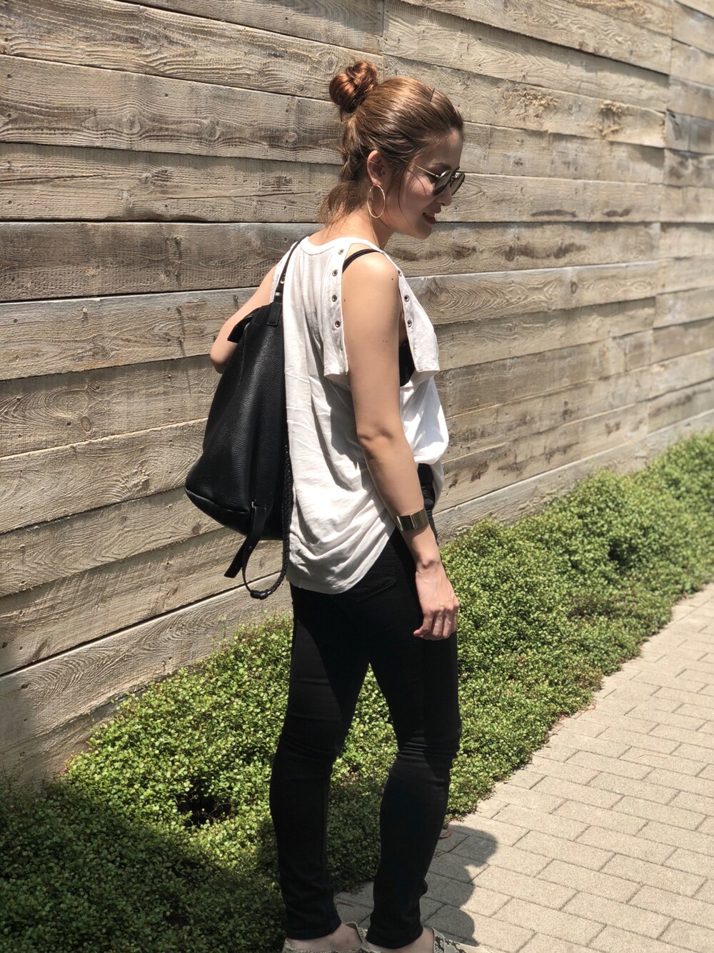 このTシャツはサイドの空き具合とピンクがかった白のカラーが好きです 全身淡いのは個人的には苦手なので、JET BLACKで引き締めます BACKPACKはPC持ち歩くので必須! いい感じにくたっとなってきてます