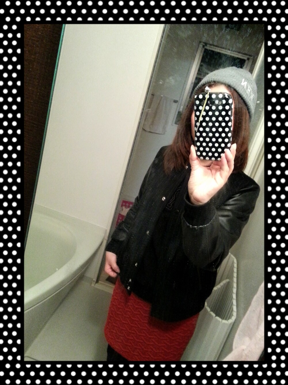 ニット帽:HARE ノーカラーブルゾン:CROON A SONG(CORTES WORKS) ロゴスウェット:unknown pleasures キルティングタイトスカート:unknown pleasures