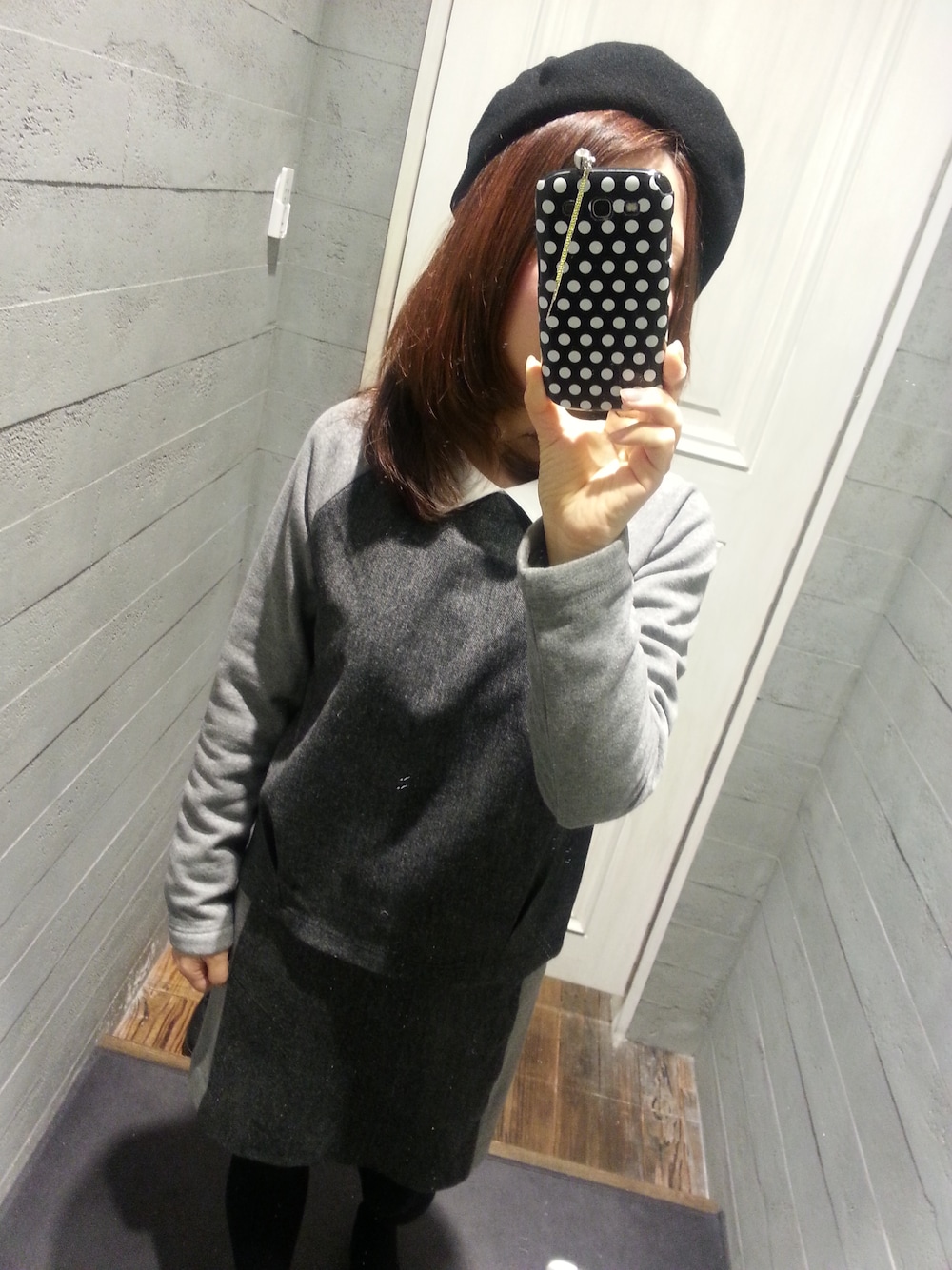 襟も取り外せる楽ちんセットアップ。 ベレー帽:ROSEBUD(NEWYORK HAT) 付け襟ツイードスウェットプルオーバー:HARE ツイードスウェットタイトスカート:HARE