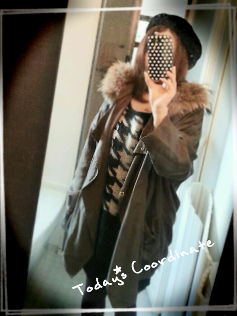 ベレー帽:ROSEBUD(NEWYORK HAT) モッズコート:CROON A SONG(CORTES WORKS) 千鳥柄切替ニットワンピ:CROON A SONG(JENEVIEVE)