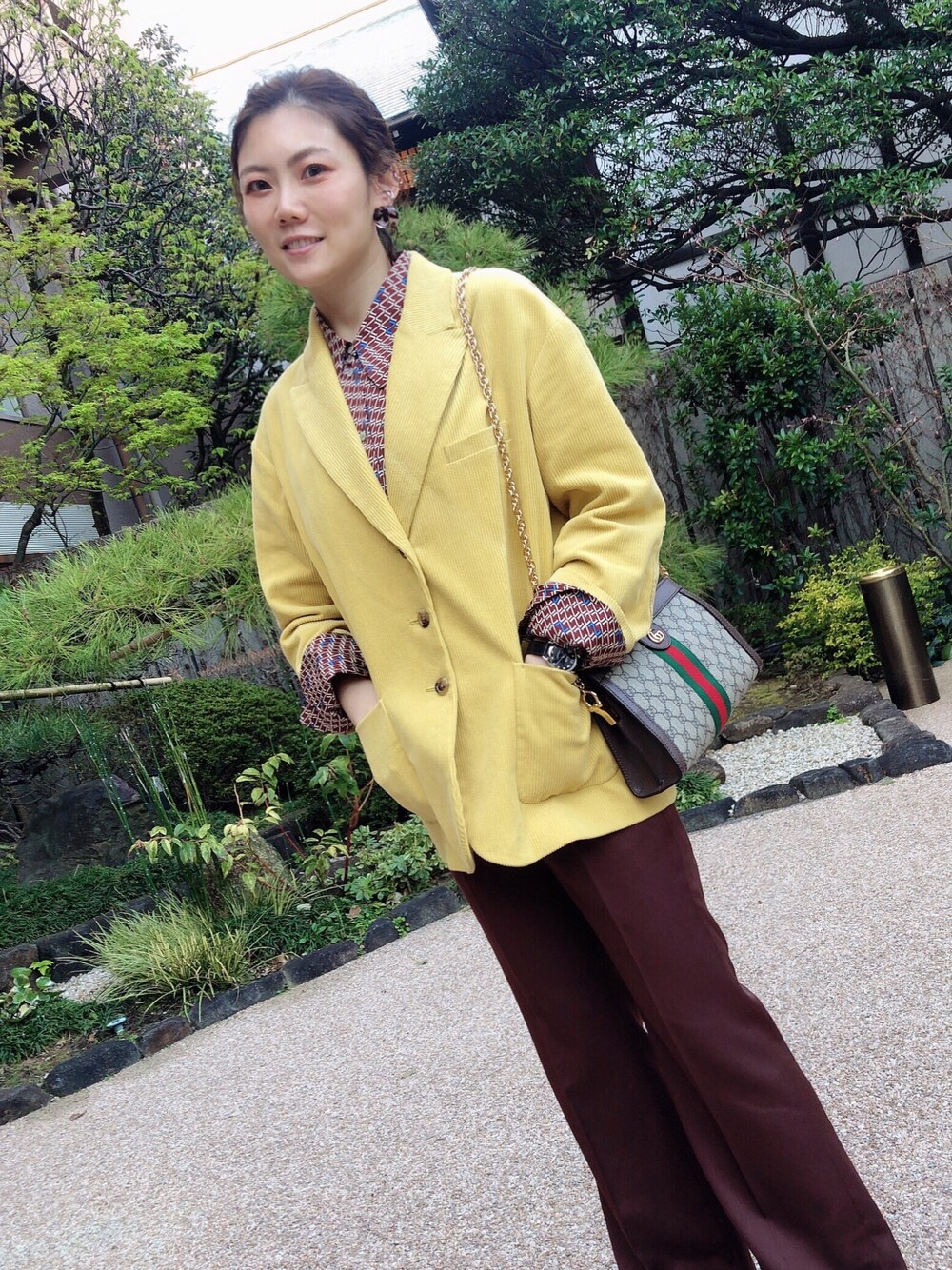 ヴィンテージを意識してコーディネートをまとめてみた~ 黄色のコーデュロイジャケットと茶色のフレアパンツの相性はいいね レトロ柄のシャツでコーディネート全体の雰囲気をうまく引き出してくれていい感じになった。