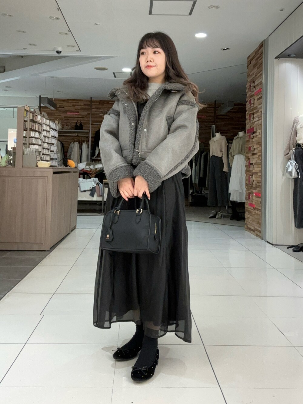 Emi【骨格ウェーブ/ブルベ冬】(one after another NICE CLAUP)のハンドバッグ「スクエアミニボストン/キーチャーム付き」を使ったコーディネート