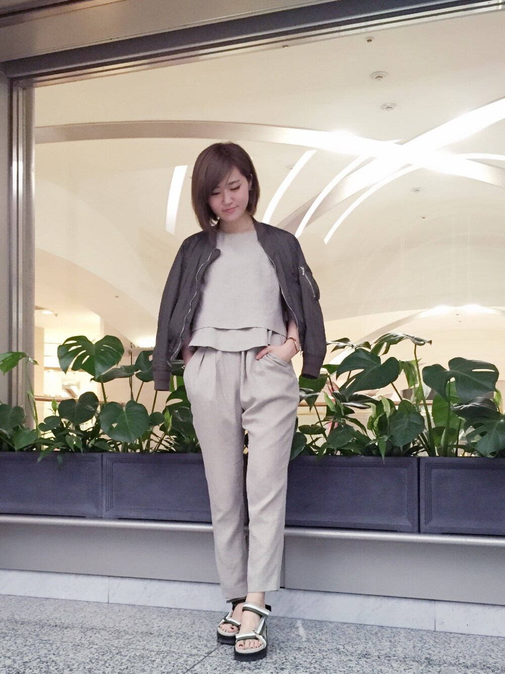 最近カーキやベージュをよく着ています🌟 リネンライクな生地は、とても着やすく大活躍していて、、はずせないアイテムです❤️ フラットサンダルでもヒールでもいいですが、敢えてのスポーツサンダルが気分かなと☺️