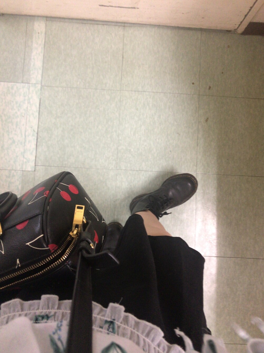 さくらんぼ柄のバッグだけど大人っぽくて可愛い❤️マーチンも久々に履いた!ロザリーのブラウスは透けてて可愛い❤️