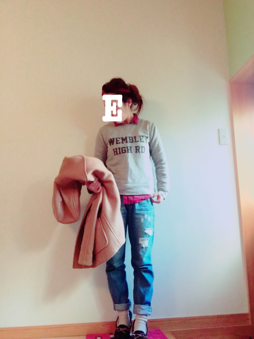 去年のGUのボルドー色ターバン シャツをそれに合わせて赤系のチェックシャツを合わせました☺︎