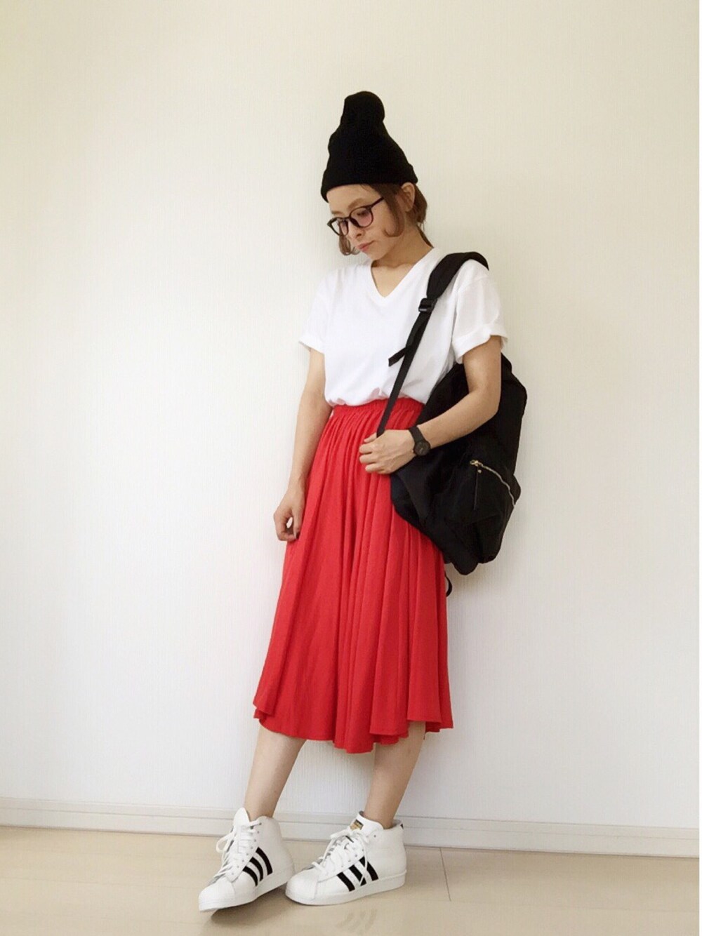 トップス→UNIQLO スカート→nobrand スニーカー→adidas リュック→グローバル スニーカーはついついハイカットを買っちゃいます! なぜならインソールを入れて底上げできるから!笑。足長+身長かさ増し効果抜群です😂 チビっこなりの努力…笑