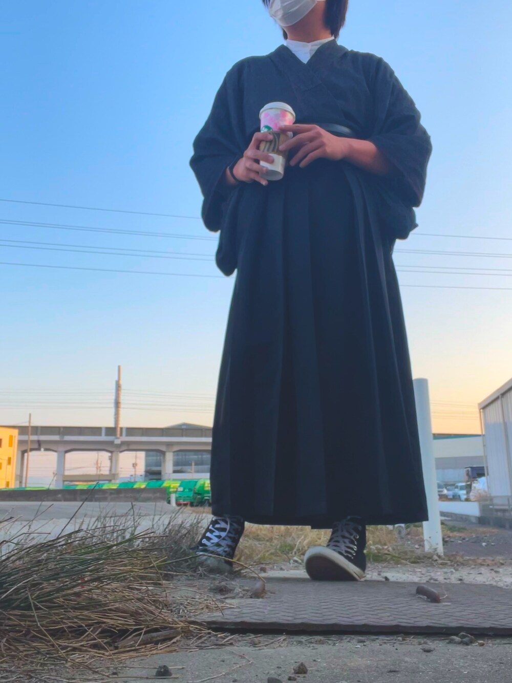 最近卒業式が沢山あったようで、袴の方を沢山お見かけしました。 ご卒業おめでとうございます! デニムの着物と行灯袴、襟なしのYシャツを着て、スニーカーを履きました。