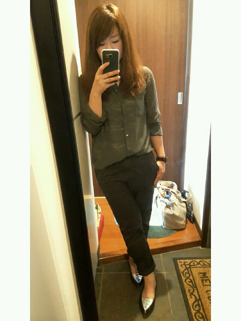 スケスケなシャツなのであえてカモフラのタンクを中に着て見せコーデ