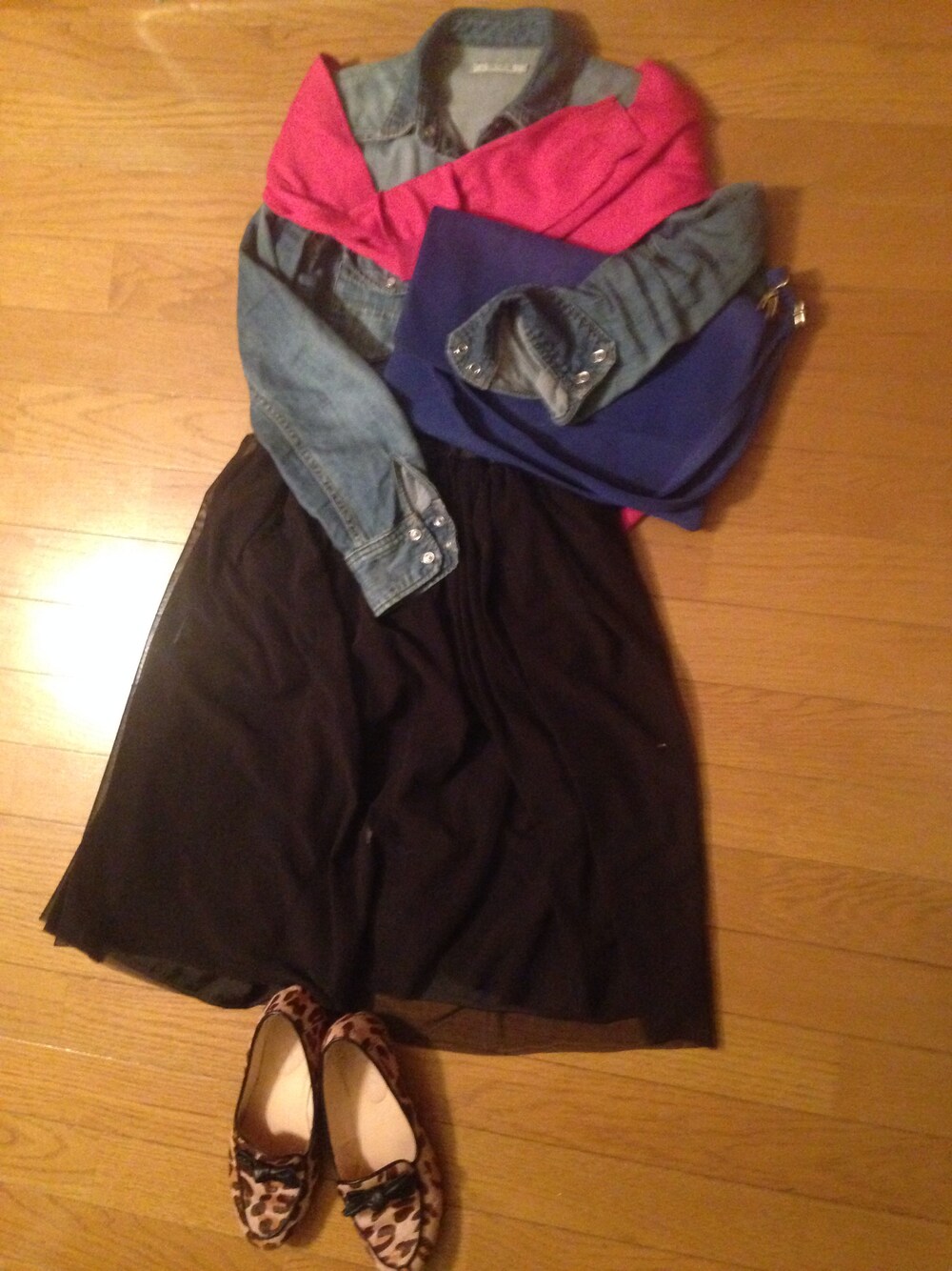 デニムシャツにチュールスカート ポイントにピンクのカーディガンを肩がけ デニムシャツ frame work