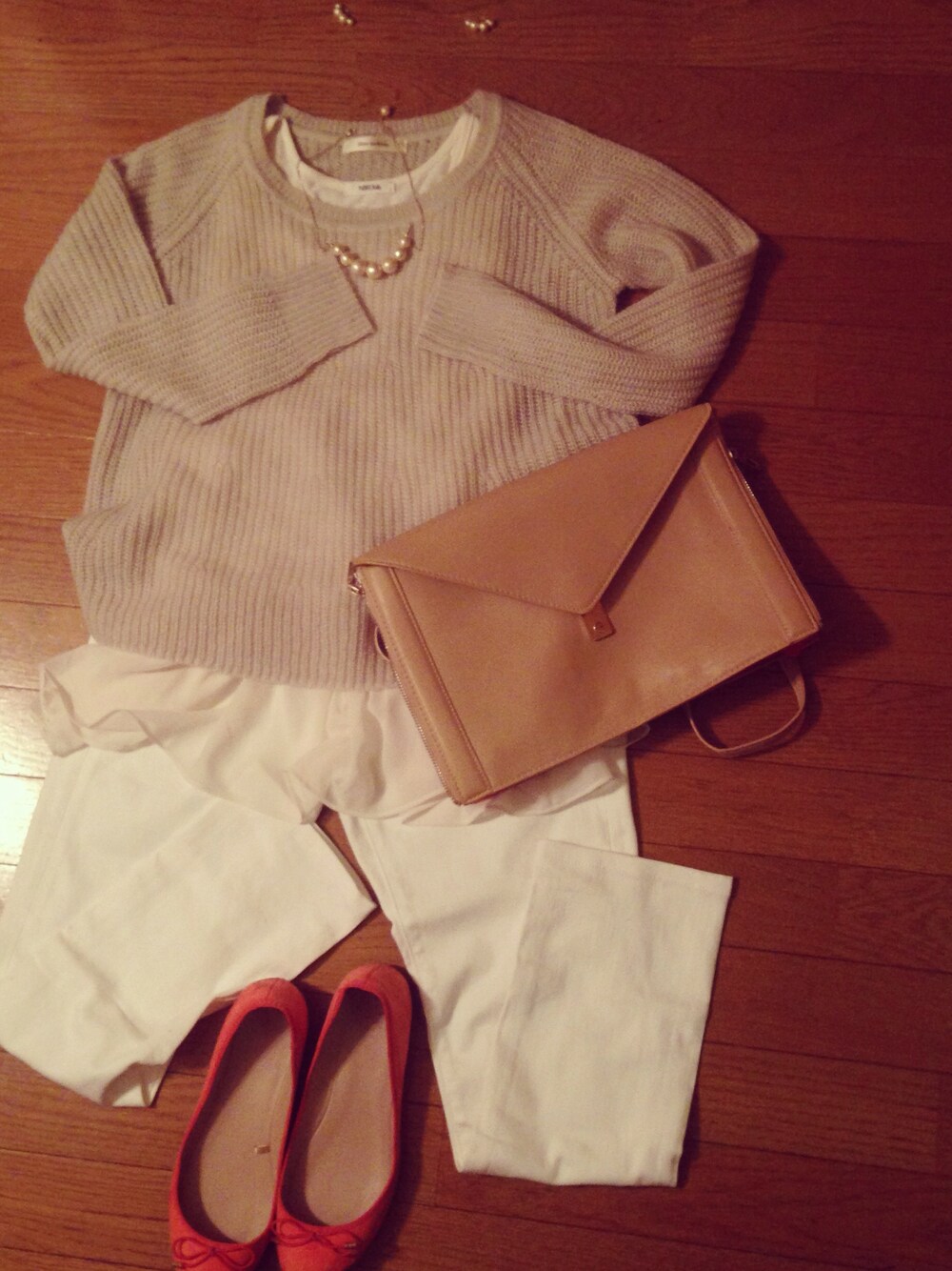 早く着たいパステルカラーニットとホワイトデニム パンプス、バッグ ZARA