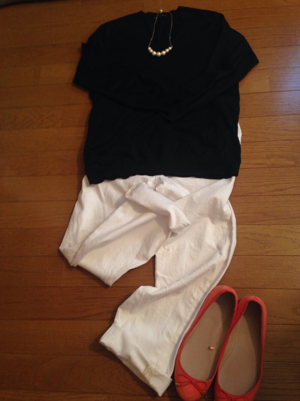 全てセール商品ですが… 上質ニットにホワイトデニムをロールアップ!足元はオレンジのバレエシューズ♥️ ニット 組曲のB品 3000円 パンツ ジャーナルスタンダードレリューム のサンプル 3000円 パンプス ZARA 2800円 ネックレス minneコットンパール 1200円 ちょうど一万円‼︎