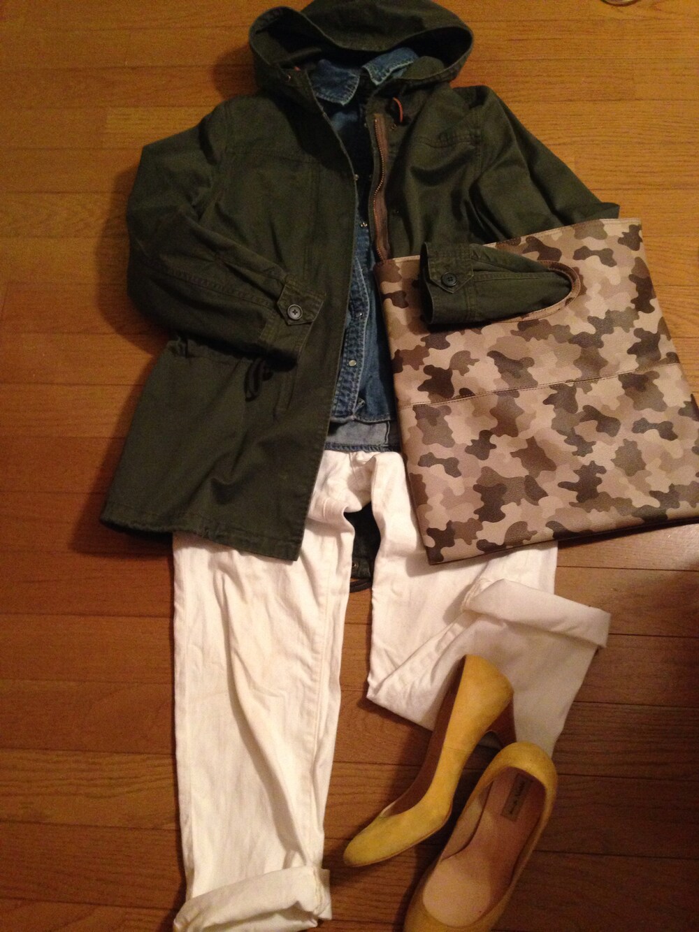 モッズコートにカモフラ柄バッグだとカジュアルになりすぎるので、足元は女性らしく