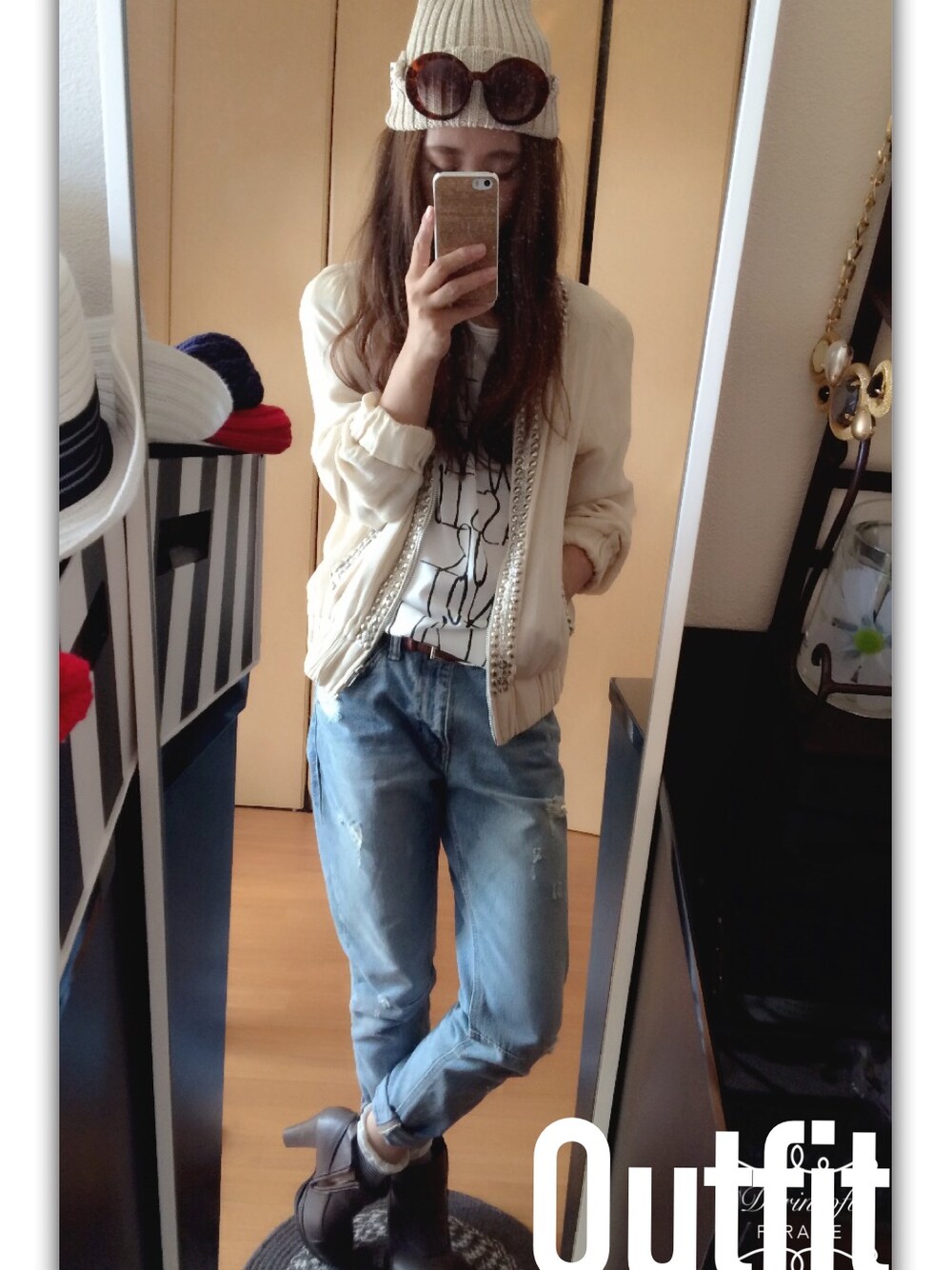 EMiのノーカラージャケット「snidelのビジュー付ノーカラージャケット♡Tシャツはセレクトショップにて☆」を使ったコーディネート
