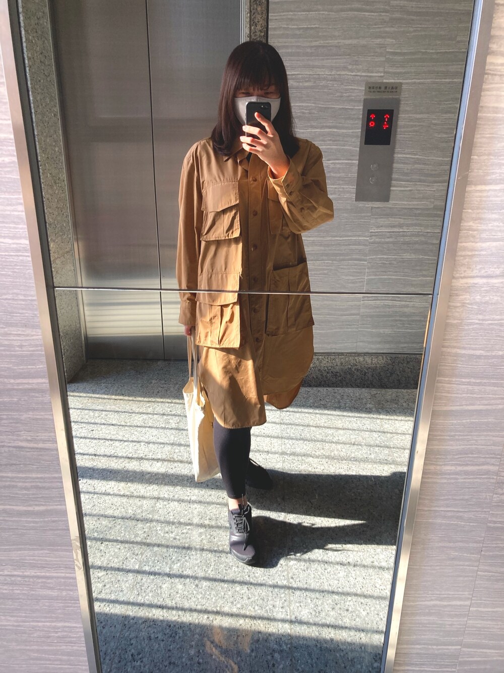 オーバーサイズのシャツワンピースのようにして着ました。シャツはツヤがあって、あまりカジュアルになりすぎないかなぁと思いチョイスしました〜ボトムスはレギンスなので脚が細く見えると期待しています♪