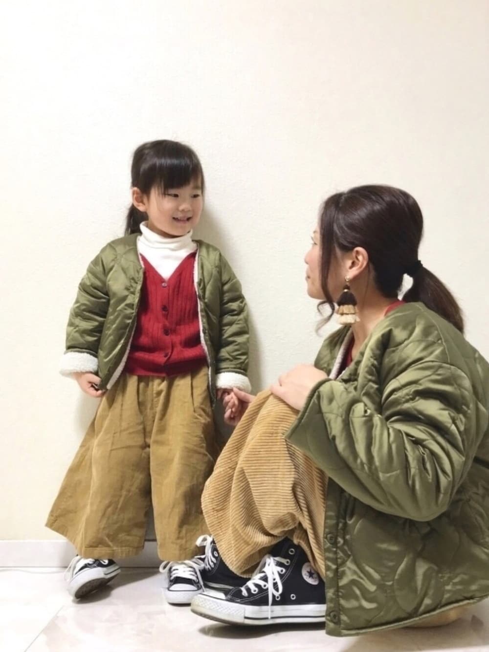 ボアキルトリバーシブルブルゾン×赤トップス×コーデュロイパンツでお祝いリンクな親子コーデ☺︎ お友達のyuricaちゃん♡ 遅くなっちゃったけど、お誕生日おめでとう🎂✨ 3歳も笑顔いっぱいの1年になりますように☺️🍀 ♡、お気に入り、フォロー、 とても嬉しく励みになっています🙇♀️ 見ていただきありがとうございました♡