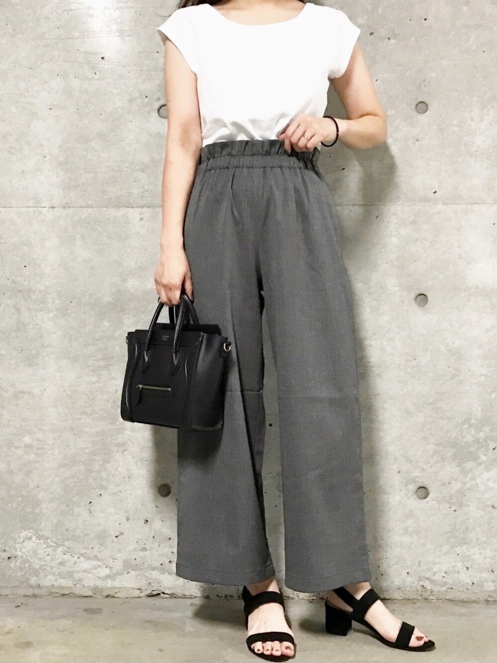 ちょっぴり秋を意識したシンプルなコーデ🌿オンラインで先行販売していたハイウエストギャザーワイドパンツは履きやすくてこれから長く使えそうです🤗💕 小物はブラックで🌿
