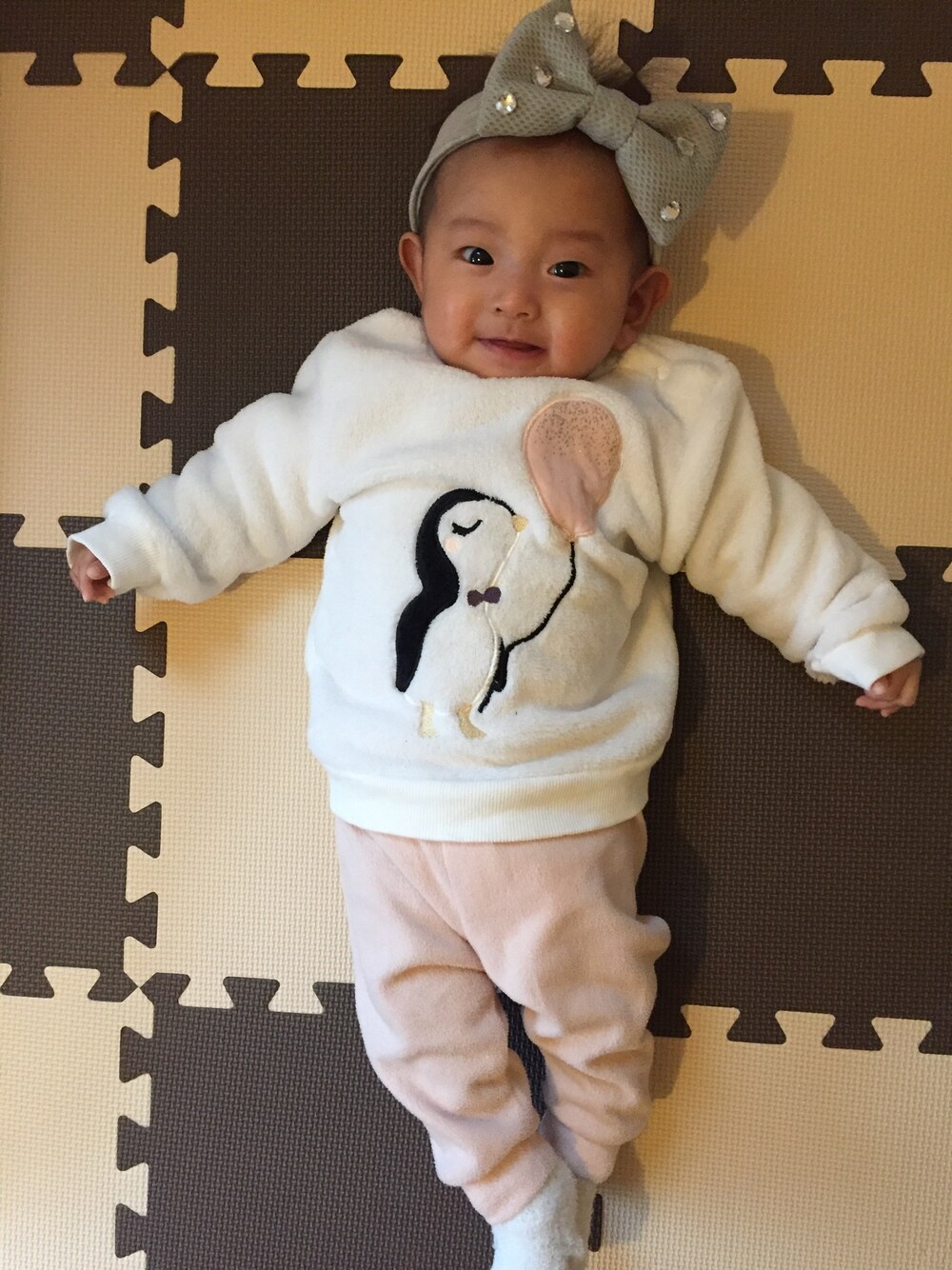 今日はヘアバンドでおめかし☆ りぼん大きすぎたかな😅 ペンギンもこもこであったかい❤️