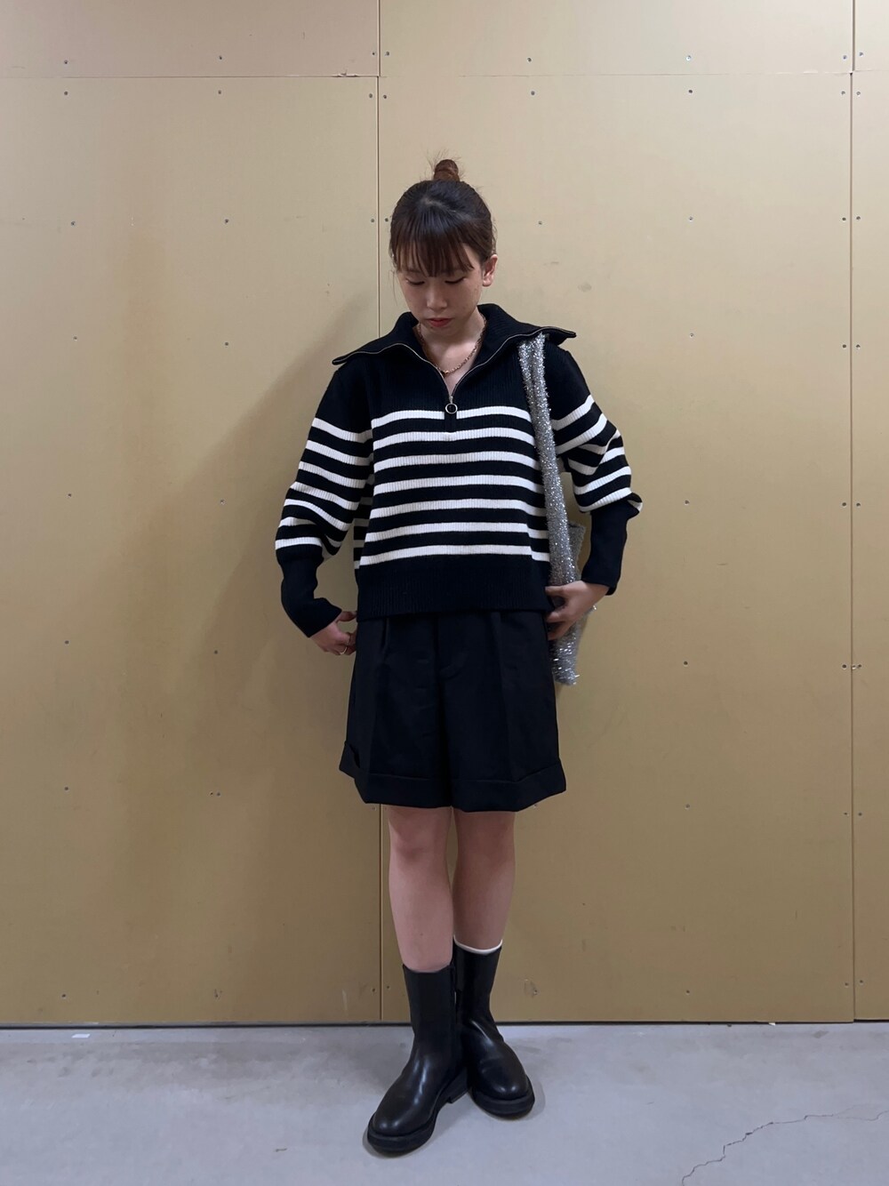 ボーダーハーフジップ×ショートパンツ オールブラックでまとめてみました🐕🦺 ハーフジップは襟が大きめなのがかわいいです☆彡 ラメバッグは斜め掛けもできます👍🏻