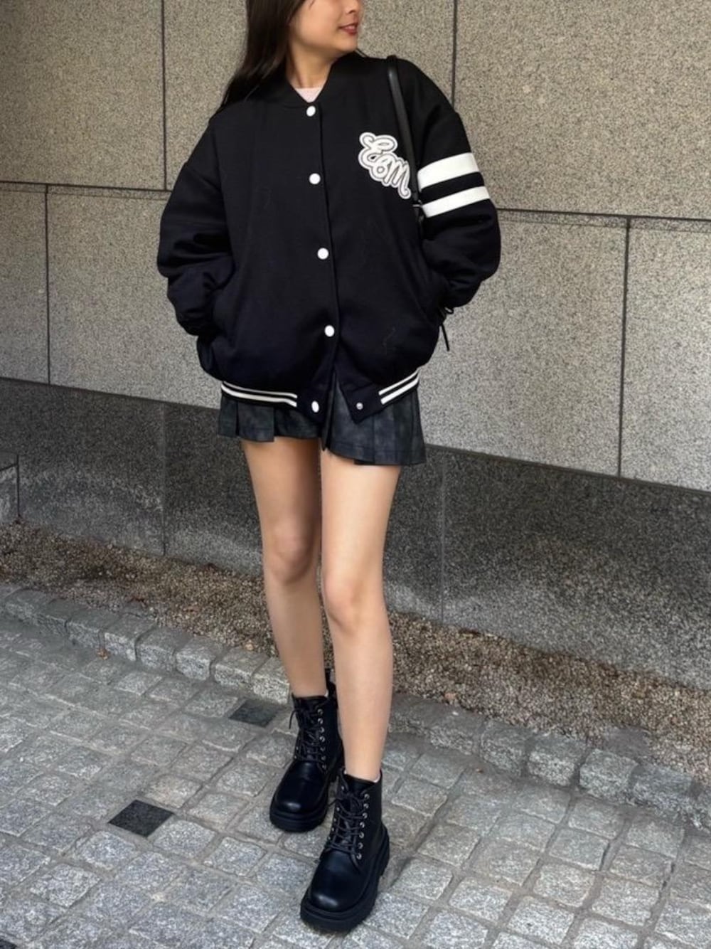 ブラックベースのかっこいいコーデ😎 韓国カジュアルな感じで可愛いです🇰🇷 袖のラインがワンポイント!
