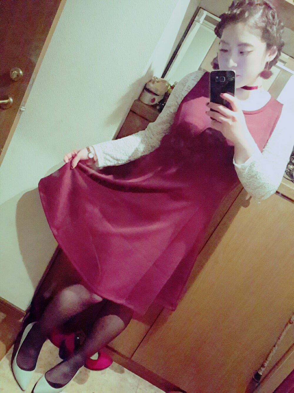 昨日は成人式で、その後仲良い子らとディナーへ...💜 いつもよりレディーライクに仕上がりました。👠💕 グレーのタイツは写真からは見えないけど、リボンのキラキラの模様が入ってます🙆
