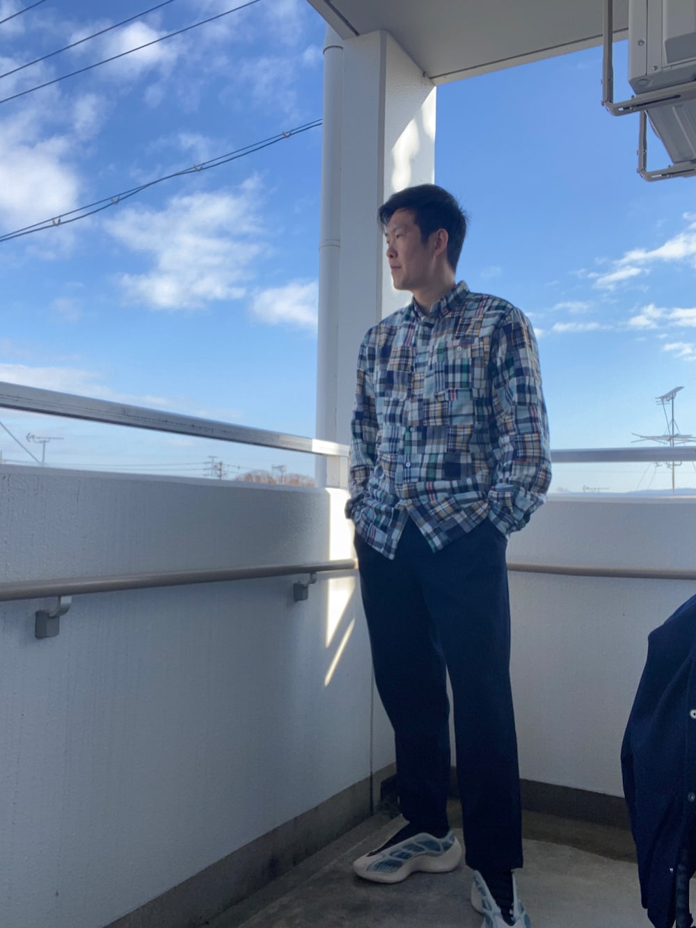 ブルー系のスラックス、ブルー系のスニーカー、ブルー系のシャツ/ブラウスを着用したメンズの冬コーディネートの1枚目の写真