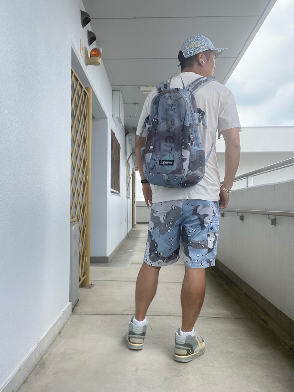 バックパックとショートパンツの柄を合わせたコーデです♪ ジムへgo💪