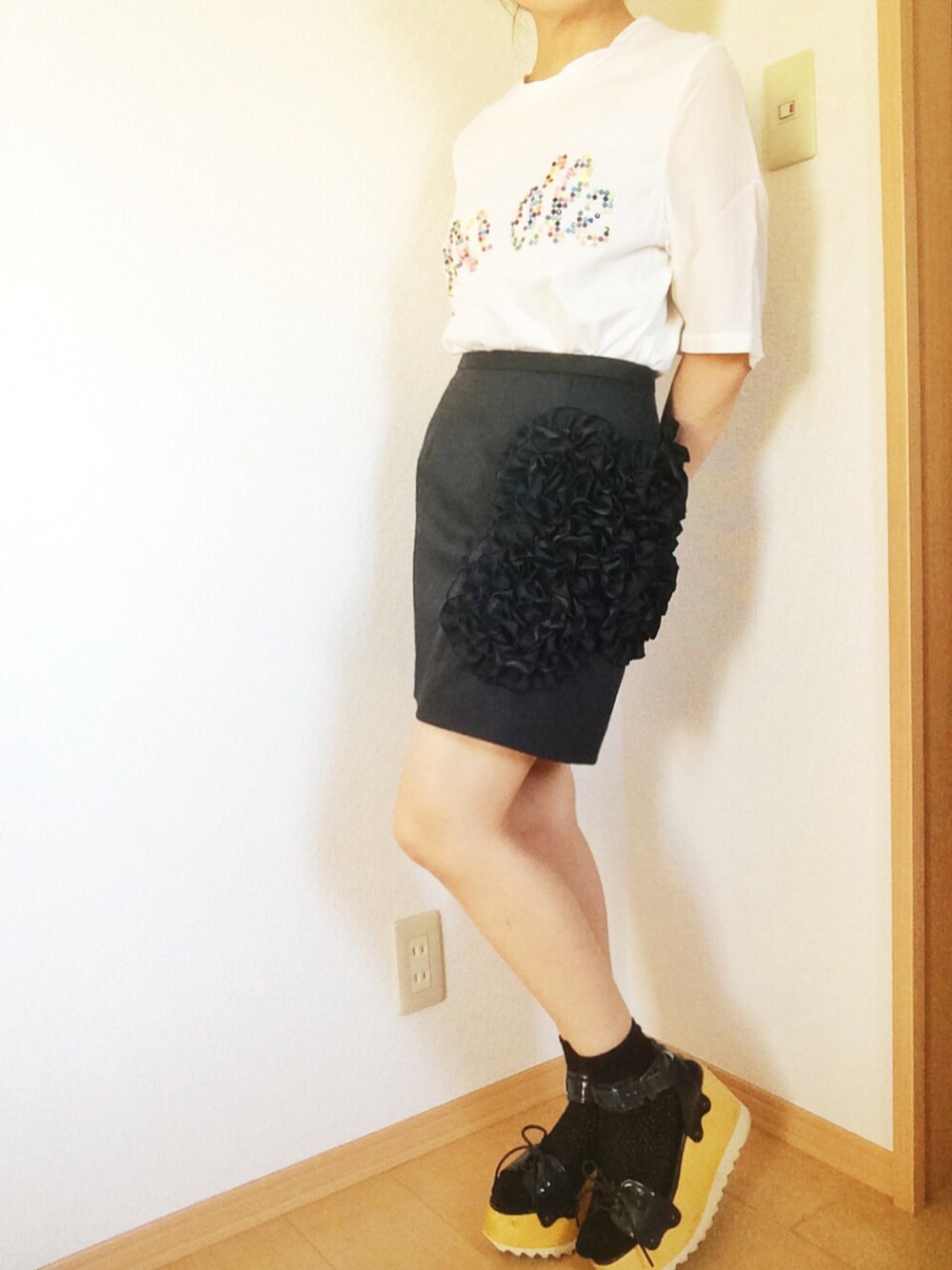 シンプルコーデ このスカートの柄のボリュームにヤられました。